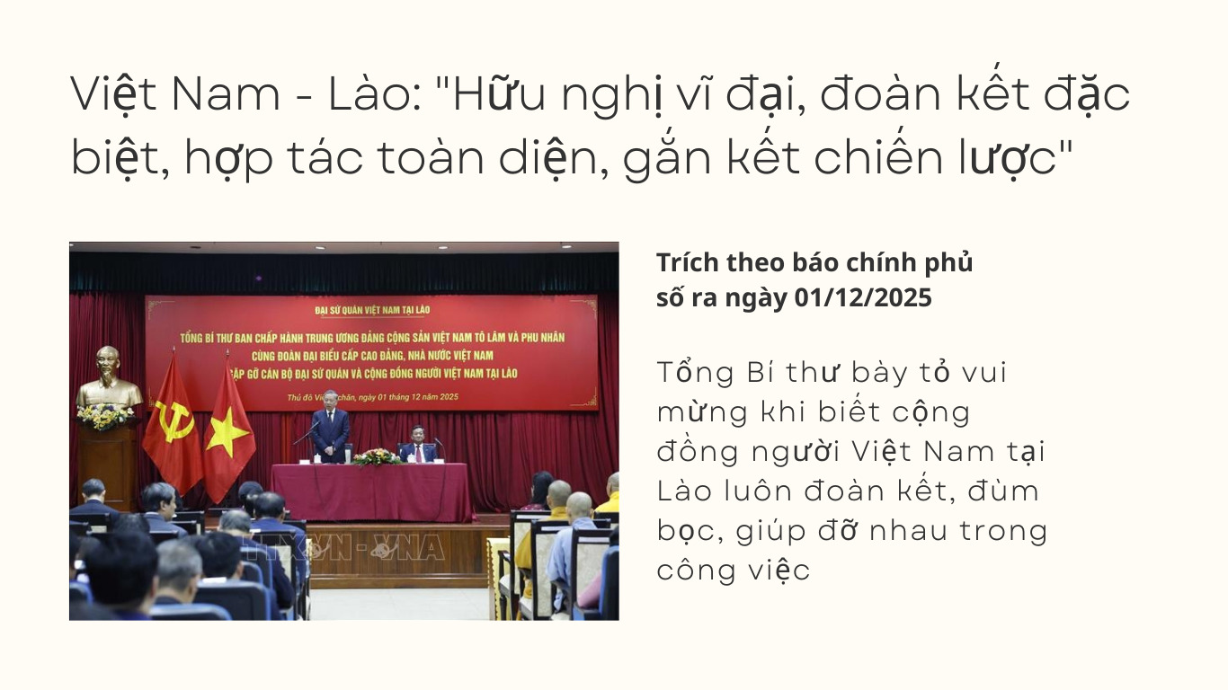 Truyền thống hữu nghị Việt – Lào không chỉ là kết quả của lịch sử mà còn là nền tảng cho sự phát triển bền vững trong tương lai. Mối quan hệ này sẽ tiếp tục được củng cố và phát triển, góp phần vào sự ổn định và thịnh vượng của cả hai quốc gia, hai dân tộc.